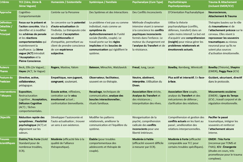 Il existe aujourd’hui de nombreuses approches psychothérapeutiques : TCC, humanistes, systémiques, psychodynamiques, thérapie des schémas, EMDR, ACT, ICV, et bien d’autres. Chaque courant s’appuie sur une histoire, des concepts et des méthodes qui lui sont propres.